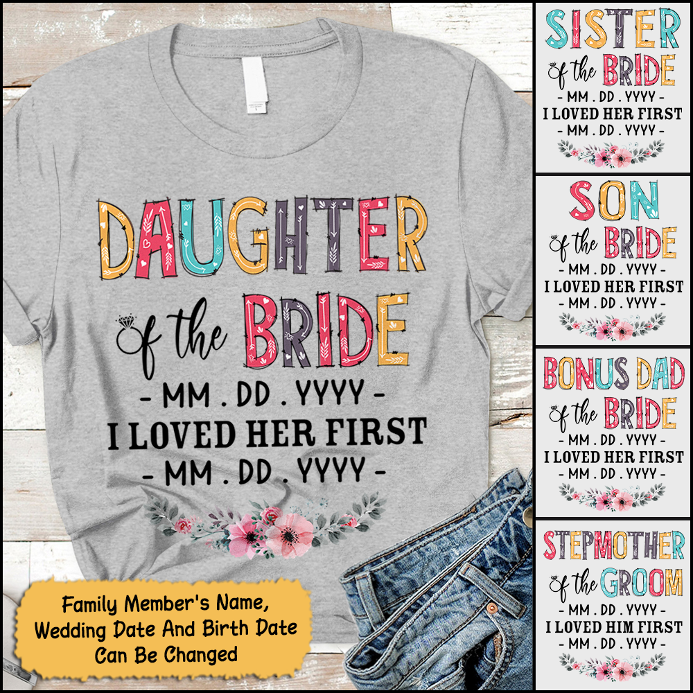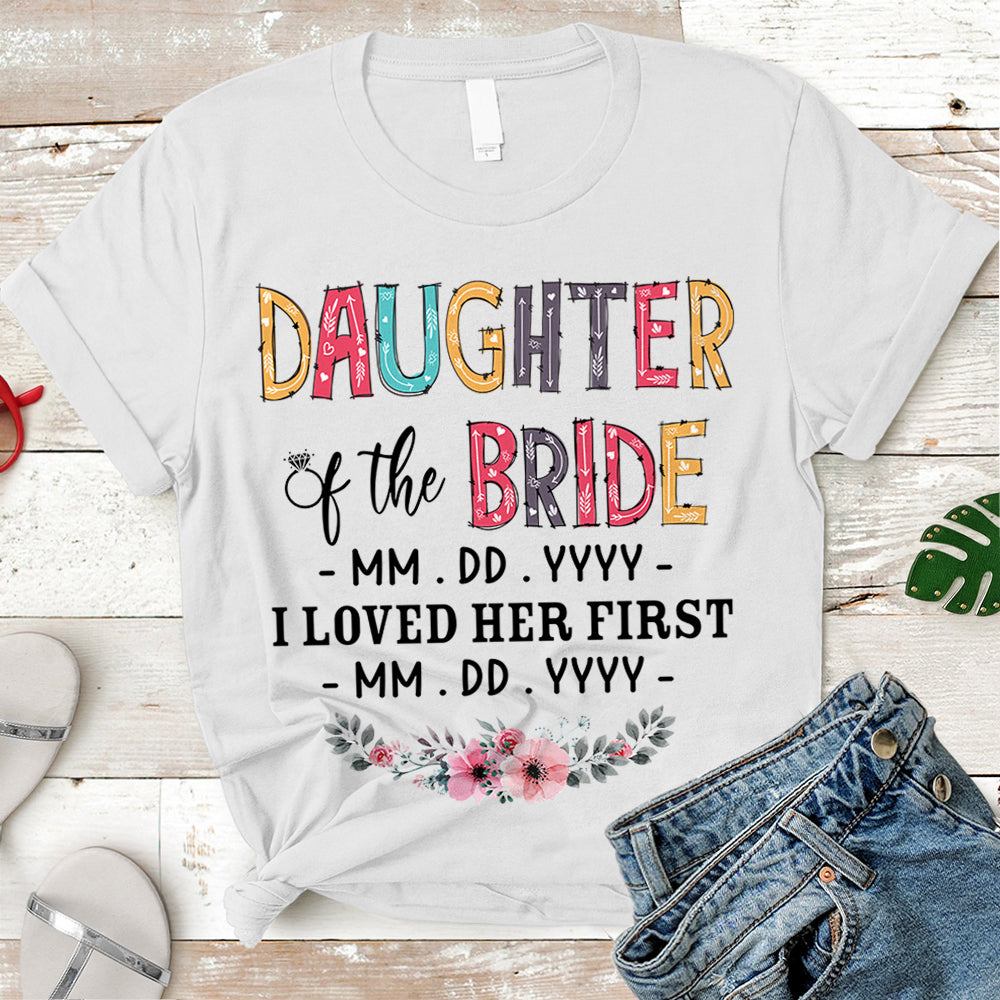 Personalized Daughter, Son, Son In Law, Daughter In Law... Of The Bride / I Loved Her First. {With Wedding Date And Birth Date} T-Shirt Color Spring